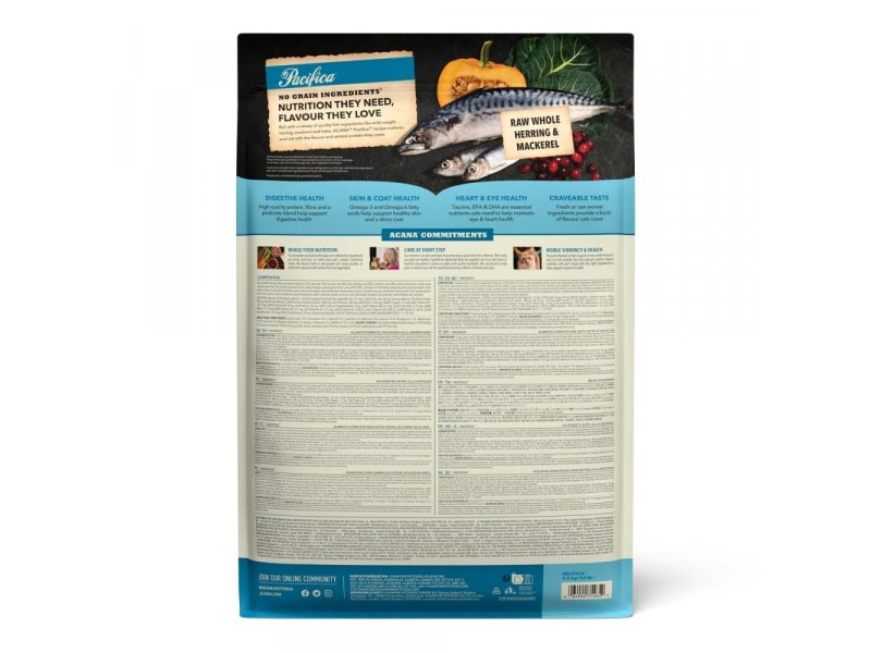 Коты анатомически приспособлены к рационам с высоким содержанием мясных протеинов. Рецептура полна разнообразными видами рыбы, включая сельдь, макрель, камбалу, хек и морского окуня, выловленных в Тихом океане. Ингредиенты представлены в соотношении WholePrey, включая филе рыбы, органы и кости. Рацион ACANA Pacifica естественно обеспечивает вашего кота нутриентами, необходимыми для отличного самочувствия, питая вашего кота, так, как задумано природой.
