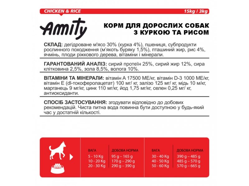 Ориентируйтесь на таблицу кормления, избегайте перекармливания животного, чтобы избежать набора лишнего веса у собаки. Если вы впервые начинаете кормить собаку сухим кормом Amity, то смена рациона должна осуществляться постепенно.
