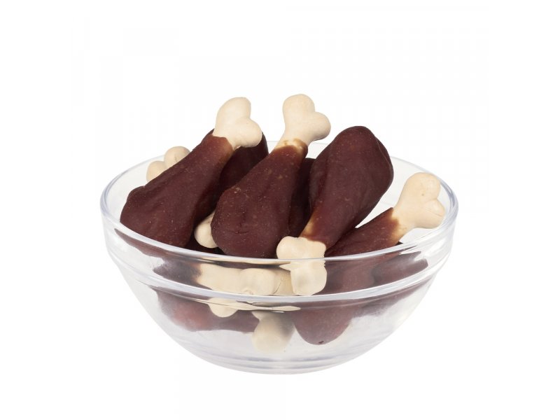 Кальциевая косточка 50,17%; куриный фарш 28,67%; крахмал кукурузный 5,38%; утиное филе 4,00%; куриное филе 3,38%; сорбит пищевой 2,06%; кукурузная мука 1,79%; гороховая мука 1,79%; глицерин пищевой 1,08%; глютен пшеничный 1,08%; соль пищевая – 0,22%; прочие добавки 0,38%.