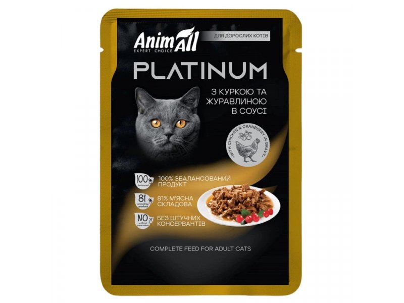 AnimAll Platinum Cat с курицей и клюквой: Легкость и польза в каждой порции. Обеспечьте своему питомцу сбалансированное питание премиального класса с AnimAll Platinum с курицей и клюквой в соусе. Это полнорационный влажный корм, созданный с учетом естественных потребностей взрослых кошек. Нежные кусочки отборной курицы в сочетании с витаминной клюквой станут любимым блюдом вашего пушистика, даря ему здоровье и жизненную энергию.