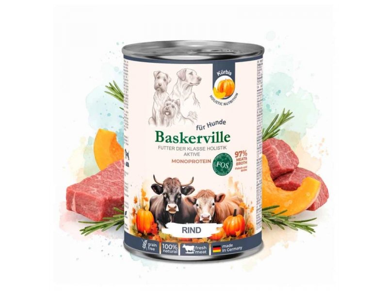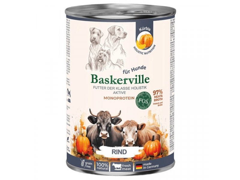 Состав Baskerville Holistic Active: говядина 68% (говяжье сердце, мясо, печень, легкие, рубец), говяжий бульон 28,5%, тыква 2%, минералы 1%, подсолнечное масло 0,3%, Фруктоолигосахариды (ФОС) 0,1%, розмарин 0,1%.