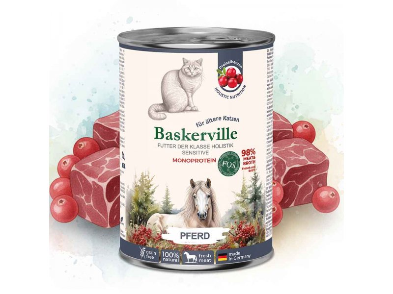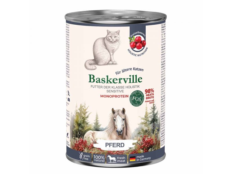 Baskerville Holistic Sensitive специально разработан для кошек с чувствительным пищеварением и пожилых питомцев, которые нуждаются в деликатном, питательном и легкоусвояемом рационе. Благодаря монопротеиновому составу и нежной формуле он легко усваивается, поддерживает комфортное пищеварение и общее самочувствие вашей кошки.
