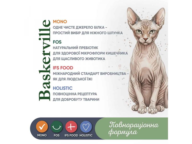 Корм Baskerville — це не просто харчування, а щоденна турбота про здоров’я, красу шерсті та добрий настрій вашої кішки. Його натуральний смак сподобається навіть вибагливим тваринам, а ви зможете бути впевнені у своєму виборі. Обирайте BASKERVILLE — якість, перевірену турботою та довірою!