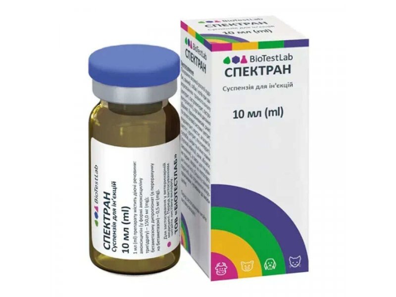 Состав BioTestLab Спектран: 1 мл препарата содержит действующие вещества: амоксициллин (в форме амоксициллина тригидрата) – 150,0 мг; бетаметазона дипропионат (в пересчете на бетаметазон) – 0,5 мг.