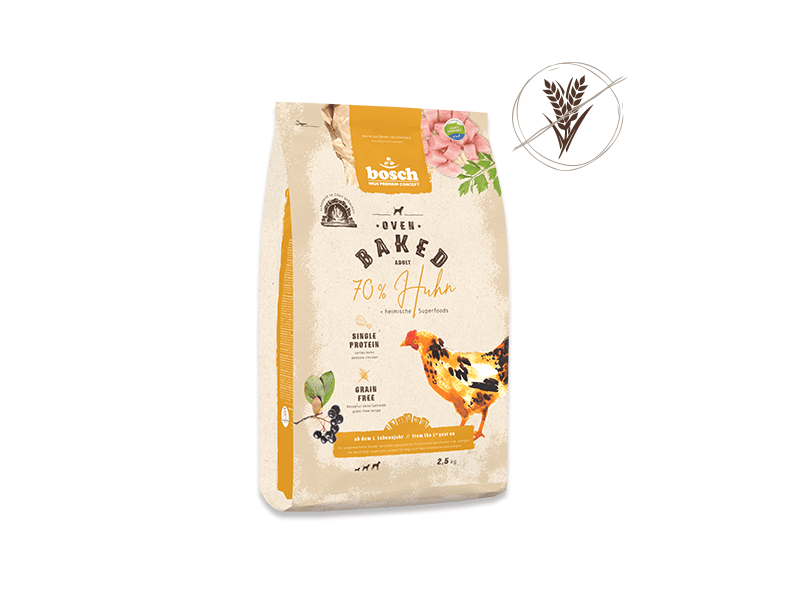 Наша запеченная в духовке свежая курица в корме Bosch HPC Oven Baked готовится в наших печах, поэтому она особенно вкусная и легко усваивается. Деликатный процесс запекания сохраняет важные микроэлементы и витамины.
