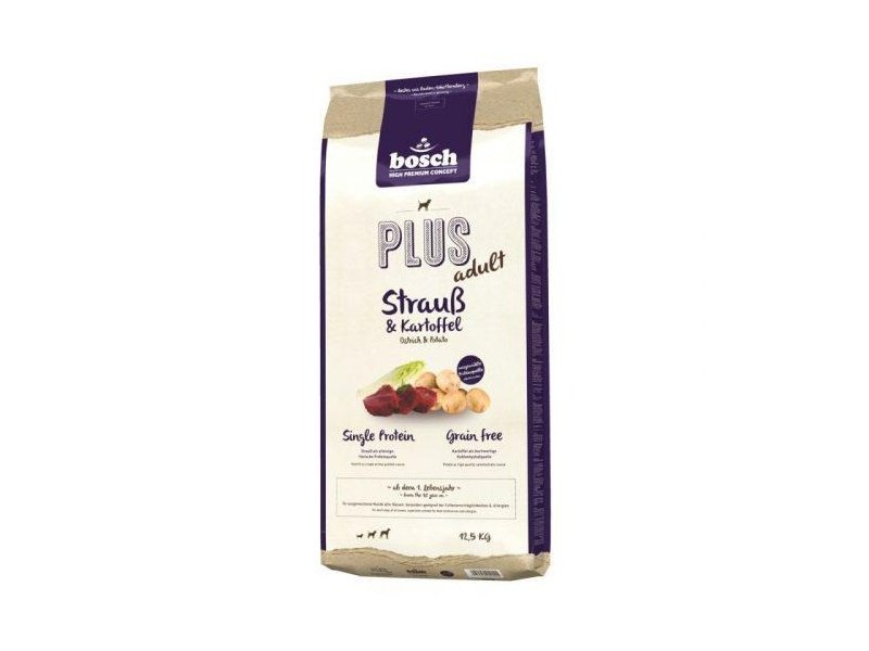 Bosch HPC Plus Strauss and Kartoffel — это корм с одним источником животного белка, созданный для полноценного и здорового питания взрослых собак.
