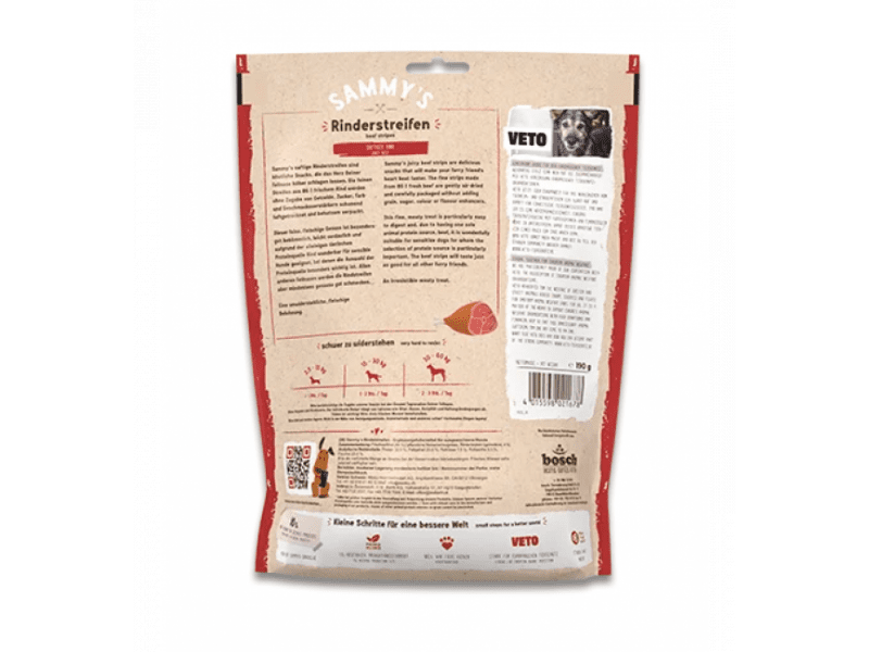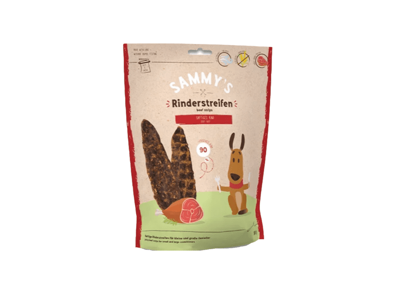 Лакомство Сэмми легко усваивается и и приятно хрустит за счет бережной сушки на свежем воздухе. Нежная обработка подчеркивает естественный вкус всех используемых высококачественных ингредиентов. Тонкое филе, на 86% состоящее из свежей говядины, бережно высушивается на воздухе и тщательно упаковывается без добавления зерна, сахара, усилителей цвета и вкуса. Это прекрасное мясное лакомство особенно легко усваивается и, поскольку единственным источником животного белка является говядина, прекрасно подходит для чувствительных собак, для которых выбор источника белка особенно важен.