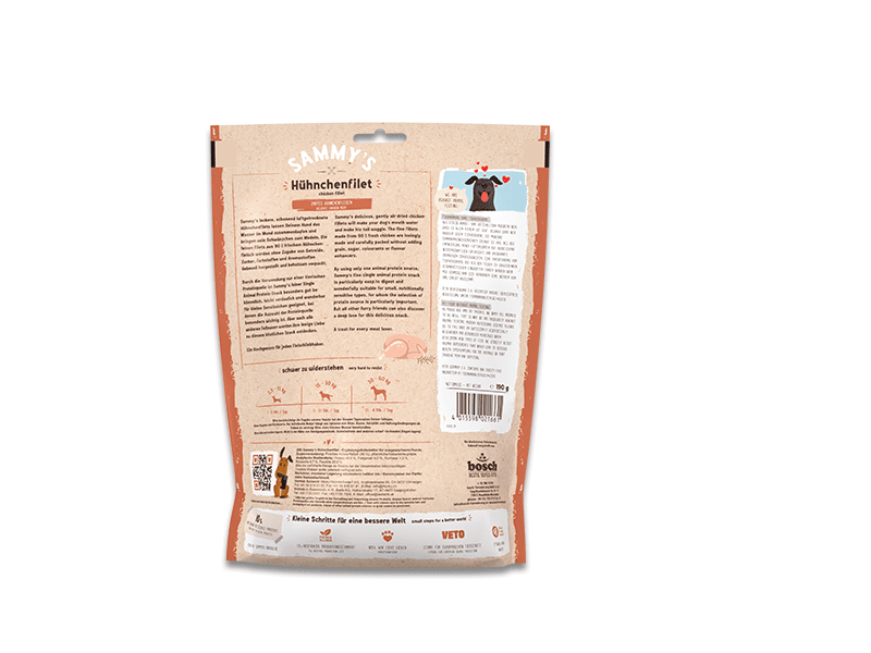 Sammy's chicken fillet содержат 90% свежей курятины, тщательно изготовлены и упакованы без добавления зерна, сахара, красителей или искусственных ароматизаторов. Благодаря использованию только одного источника животного белка, лакомство прекрасно усваивается, легко переваривается и подходит даже для чувствительных собак, которым важно контролировать состав рациона. Но будьте уверены – любой четырехлапый гурман оценит этот вкус.