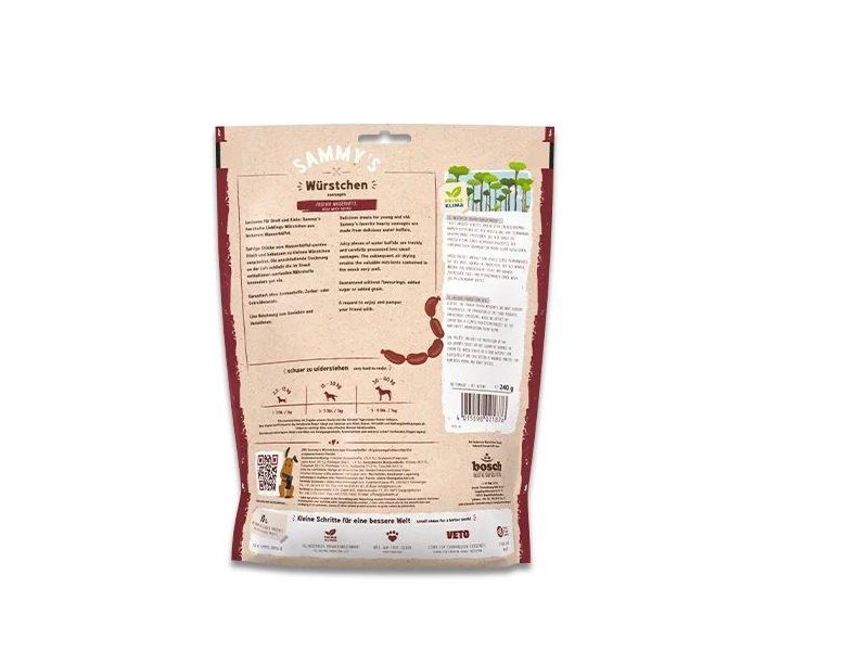 Состав Bosch Sammy`s Sausages : свежий пресноводный буйвол (75,6%), белок пресноводного буйвола (сухой, 20,5%), коллаген (кишечник, 1,5%).