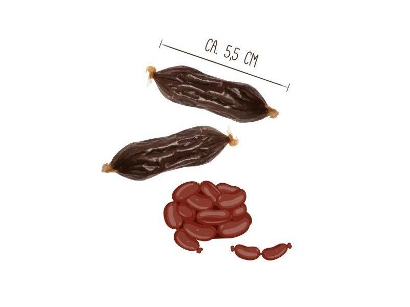 Свежие и тщательно обработанные кусочки буйволятины превращаются в маленькие колбаски, содержащие только один вид животного белка (Single Animal Protein). Благодаря сушке на воздухе особенно хорошо сохраняются ценные питательные вещества, содержащиеся в лакомстве. Гарантировано без ароматизаторов, добавленного сахара или зерновых.