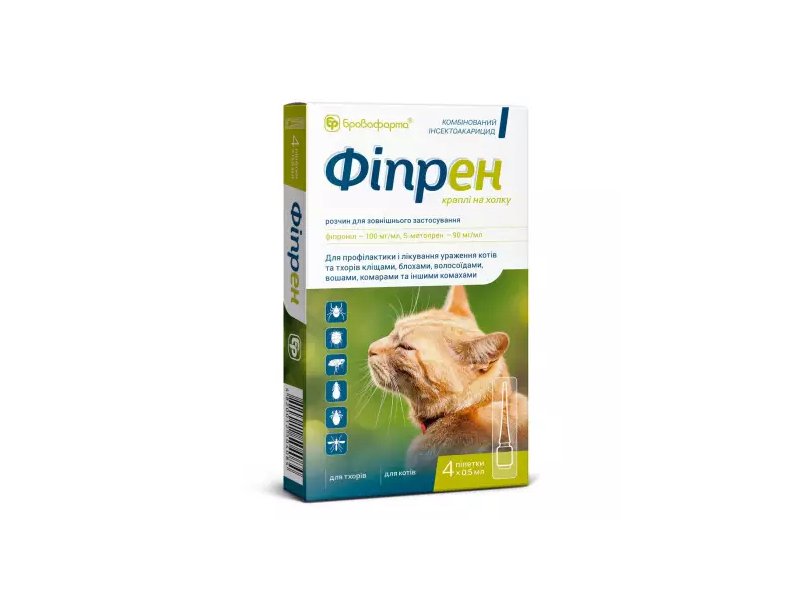 Бровафарма Фипрен для профилактики и лечение котов и хорьков при энтомозах, вызванных блохами, вшами и власоедами, акарозах, вызванных паразитиформными клещами и саркоптоидным клещем Sarcoptes canis, для предотвращения прикрепления и развития эктопаразитов.