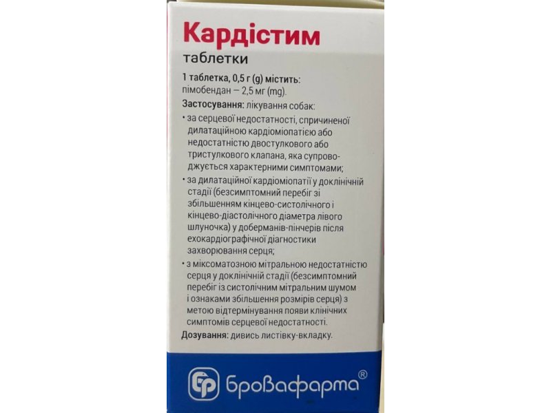 Бровафарма Кардистим — лекарственный препарат для собак на основе пимобендана. Средство воздействует на сердечно-сосудистую систему как кардиостимулятор. Его применяют при нарушениях работы сердца, вызванных недостаточностью клапанов или дилатационной кардиомиопатией. Препарат должен назначать только врач ветеринарной медицины, если у собаки есть одышка, кашель, асцит и снижена активность. Аналогами Кардистима являются Ветмедин, Пимобендан, Кардишур и Хартмедин.