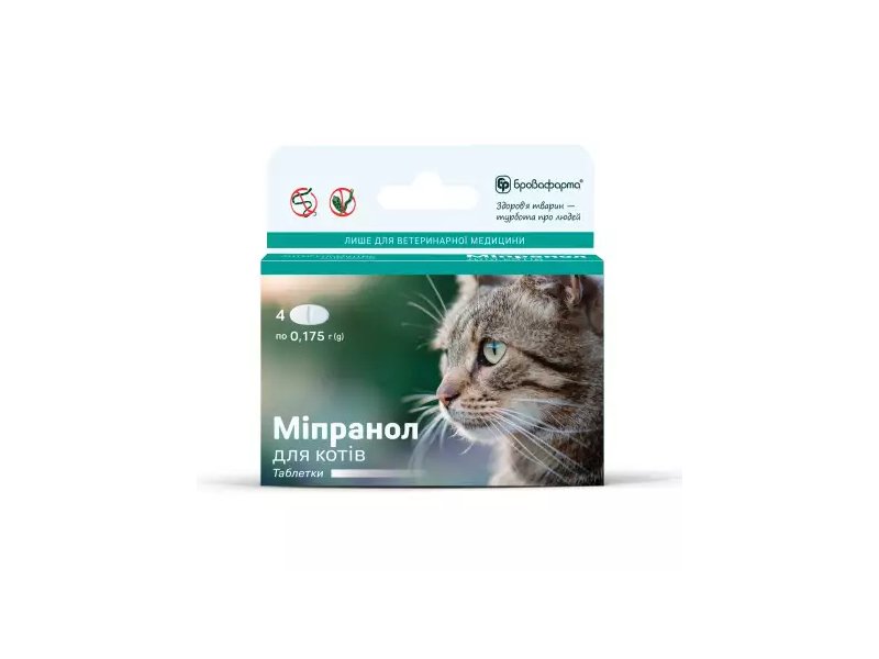 Бровафарма Мипранол используют для профилактики и лечение котов при инвазиях, вызванных цестодами Dipylidium сапипит, Taenia spp., Echinococcus multilocularis и/или нематодами Ancylostoma tubaeforme, Toxocara cati. Профилактика дирофиляриоза (Dirofilaria immitis) при одновременном применении препарата от цестод.