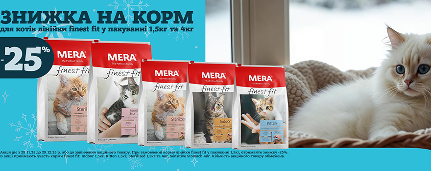 Акция на корм для кошек Mera: скидка до 25%! Воспользуйтесь возможностью приобрести высококачественный корм Mera для кошек со скидкой до 25%. Обеспечьте своему питомцу здоровое и вкусное питание супер-премиум класса по выгодной цене!