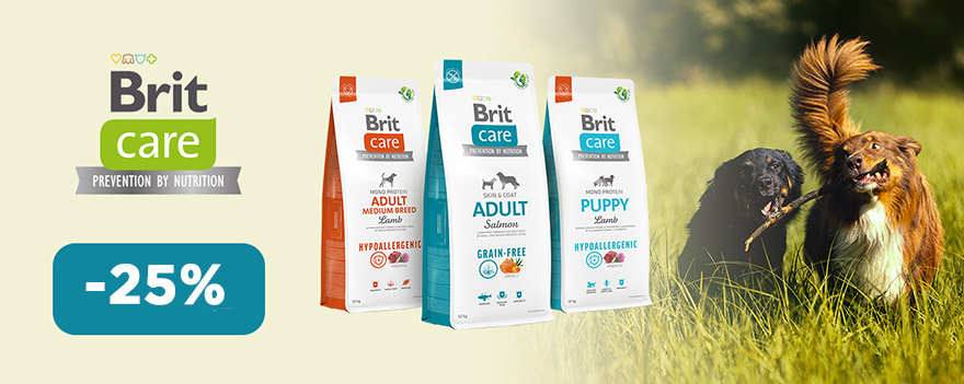 Порадуйте своего четвероногого друга — и сделайте это с выгодой! Сейчас действует скидка до 25% на широкий ассортимент продукции для собак Brit Care: