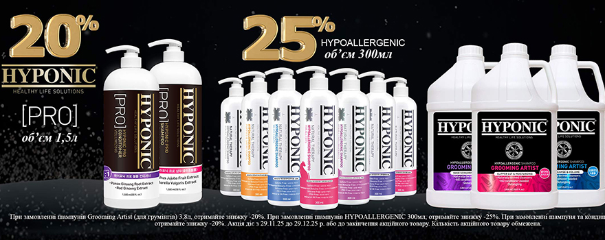 Акция на косметику для кошек и собак Hyponic: скидка до 25%! Воспользуйтесь возможностью приобрести высококачественную косметику Hyponic со скидкой до 25%. Обеспечьте своим питомцам нежный уход за кожей и шерстью по выгодной цене: