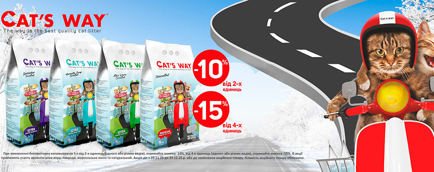 Акция на наполнители для кошачьего туалета Cats Way: скидка 15%! Воспользуйтесь возможностью приобрести качественные наполнители Cats Way со скидкой 15%. Обеспечьте своему коту комфорт и чистоту по выгодной цене!