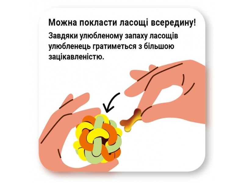 Необычная переплетённая форма делает мяч удобным для захвата пастью и стимулирует естественный инстинкт жевания. А если внутрь спрятать лакомство, игра станет ещё интереснее: питомец будет катать, кусать и пытаться достать вкусняшку, развивая смекалку.