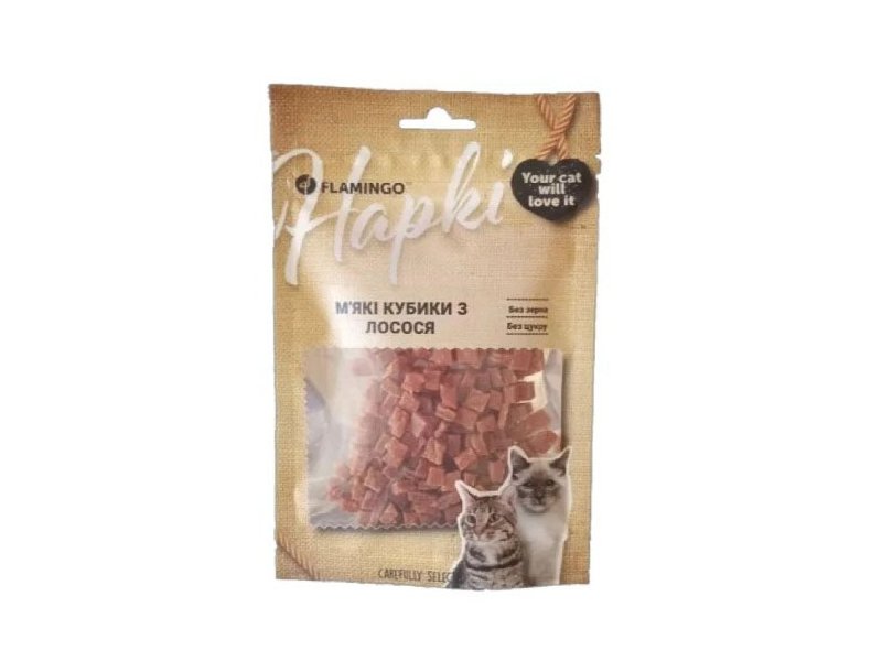 Состав Flamingo МЯГКИЕ КУБИКИ ИЗ ЛОСОСЯ: лосось – 80%, курица – 7,5%, картофельный крахмал – 6,8%, глицерин – 2,7%, растительный белок – 1,1%, соевый белок – 1,6%, соль – 0,2%