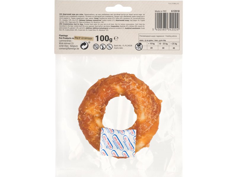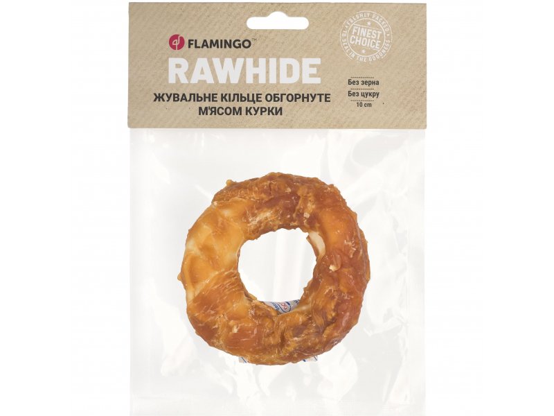 Состав Flamingo ЖЕВАТЕЛЬНОЕ КОЛЬЦО ОБВЕРНУТОЕ МЯСОМ КУРИЦЫ: сыромятная кожа 47%, утка 45%, картофельный крахмал 4%, растительный белок 2%, глицерин 1,8%, соль 0,2%.