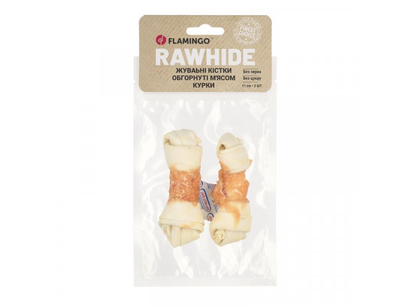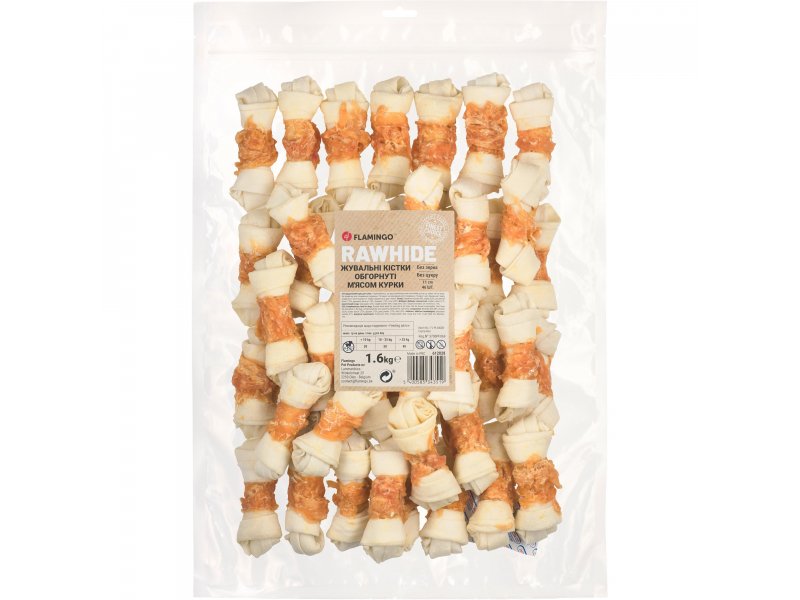 Состав Flamingo ЖЕВАТЕЛЬНЫЕ КОСТОЧКИ ОБВЕРНУТЫЕ МЯСОМ КУРИЦЫ: сыромятная кожа 68%, курица 26,5%, крахмал батата 1,75%, глицерин 1,75%, растительный белок 1,75%, соль 0,25%.