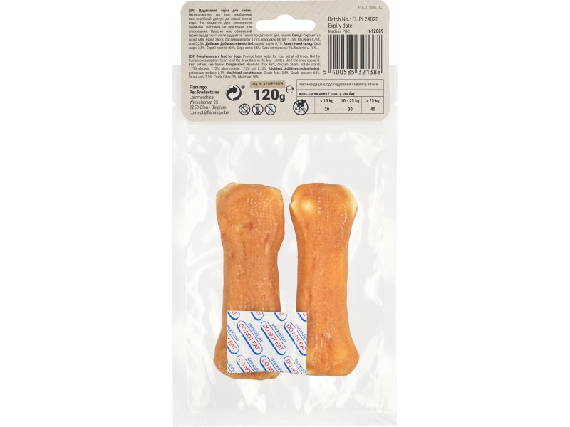 Состав Flamingo ЖЕВАТЕЛЬНЫЕ КОСТОЧКИ С МЯСОМ КУРИЦЫ: Сыромятная кожа 68%, курица 26,5%, крахмал батата 1,75%, глицерин 1,75%, растительный белок 1,75%, соль 0,25%.
