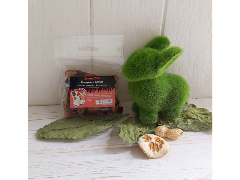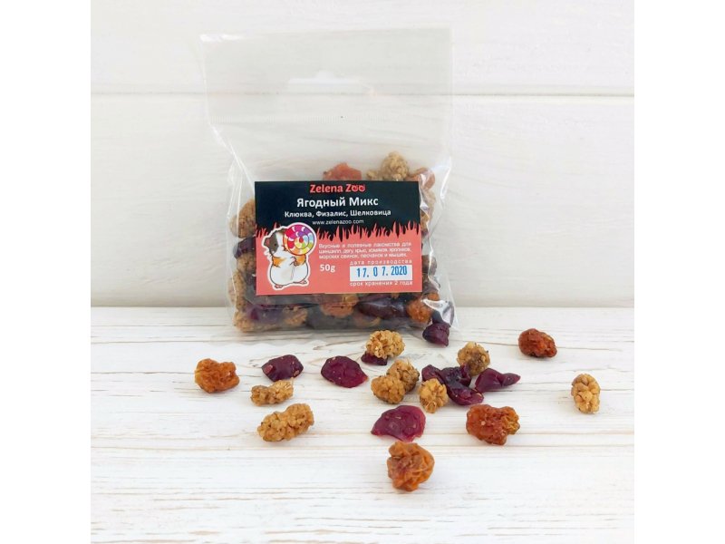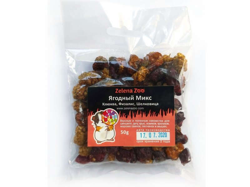 Ягодный микс (клюква, физалис, шелковица) 50 г Zelena Zoo - вкусное и полезное лакомство супер премиум класса для шиншилл и дегу, а также для хомяков, кроликов, морских свинок, песчанок, крыс и мышей. Ягоды шелковицы и малины нормализуют обмен веществ в организме, являются прекрасным средством для повышения иммунитета и сопротивления болезням, их употребление поднимает любимым грызунам настроение и повышает общий тонус организма.