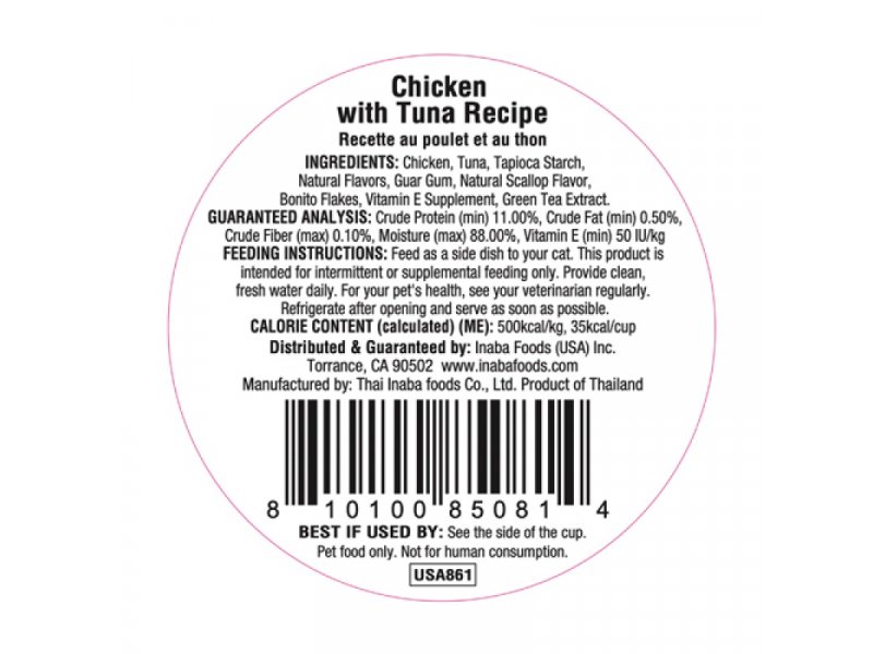 Ингредиенты Inaba Cat Dashi Delights: курица, тунец, лосось, тапиоковый крахмал, натуральные ароматизаторы, гуаровая камедь, экстракт гребешка, хлопья бонито, добавка витамина Е, экстракт зеленого чая.