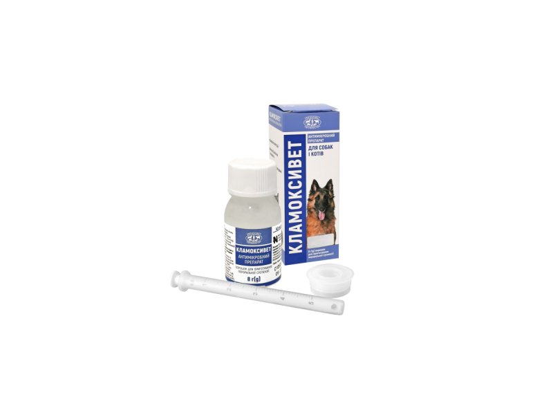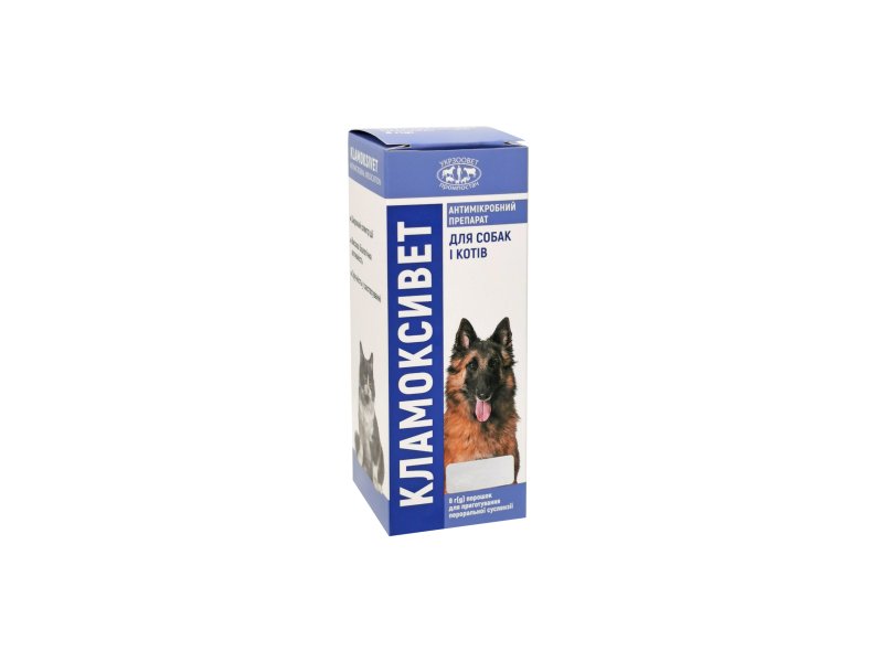 Кламоксивет 50 мл, порошок для пероральной суспензии. Кламоксивет применяется для лечение собак и кошек при заболеваниях кожи (включая глубокую и поверхностную пиодермию), мягких тканей (абсцессы и анальный сакулит), ротовой полости (в частности, гингивит), мочевыводящих путей, органов дыхания (включая заболевания верхних и нижних дыхательных путей), пищеварительного канала (энтериты), которые вызваны микроорганизмами, чувствительными к амоксициллину и клавулановой кислоте.