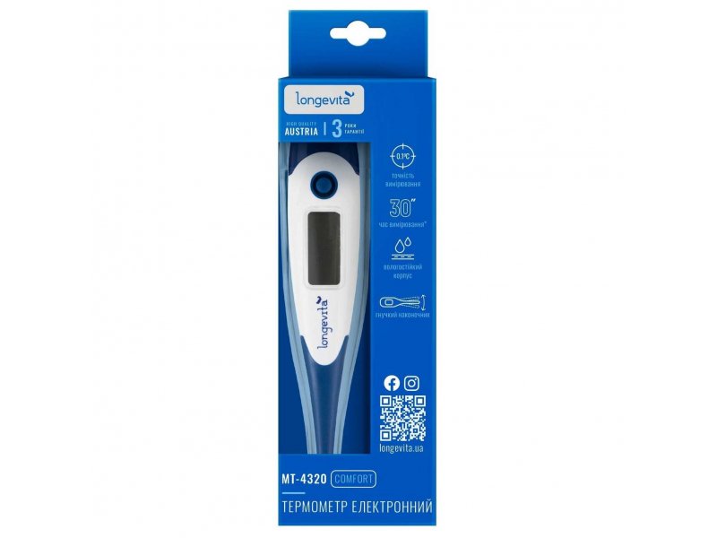 Увеличенный дисплей, на котором отображаются показатели, и простота использования делает электронный термометр Longevita MT-4320 комфортным для использования.