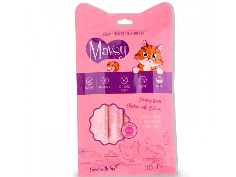 Ключевой особенностью этого лакомства является сочетание высококачественного куриного мяса и лосося. Курица имеет пикантный вкус и является богатым источником белка, в то время как лосось придает нотку вкусу морепродуктов и снабжает жирными кислотами Омега-3, необходимыми для здоровья шерсти и кожи. Это замечательное сочетание вкусов делает Mavsy действительно непревзойденным лакомством для вашего любимца.