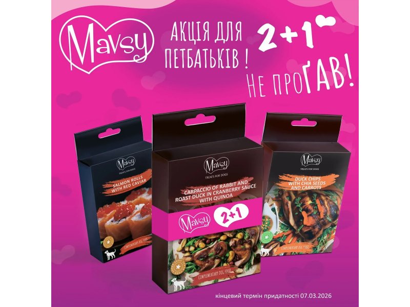 С 8 сентября по 1 декабря 2025 года действует специальное предложение на линейку Mavsy Refined jerky — премиальные лакомства для собак, созданные по уникальным рецептам из натуральных ингредиентов.
