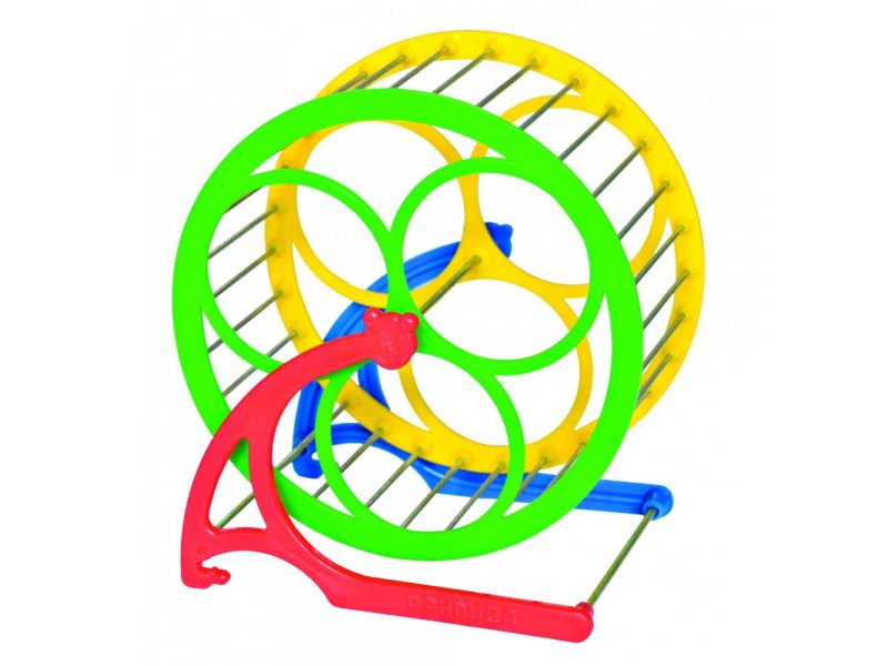 Ведь это не только развлечение, но и возможность поддерживать мышцы в тонусе, нормализовать обмен веществ, удовлетворить природную потребность в движении. Яркое колесо на устойчивой подставке изготовлено из качественной пластмассы, не содержащей токсичных или опасных для животных веществ. Перекладины сделаны из прочной проволоки. Аксессуар легко моется, прост в уходе и придаст интерьеру клетки праздничный вид. По желанию колесо можно установить снаружи клетки, но не следует оставлять в нем зверька без присмотра.