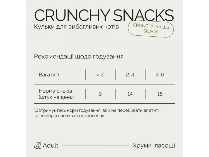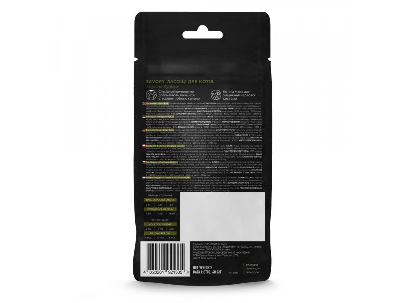 Дополнительное питание для котов Savory Cats Snacks Crunchy Balls, обогащенное витаминами и таурином. Хрустящие шарики улучшают кровообращение десен и механически очищают зубной налет. Также хорошо подходят для пожилых любимцев и тех, у кого есть проблемы с чувствительностью зубов. Кошачья мята не только привлекает взыскательных гурманов, но и укрепляет нервную систему, а гексаметафосфат натрия обеспечивает профилактику зубного налета.