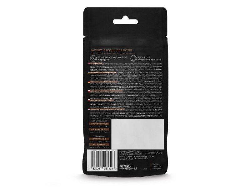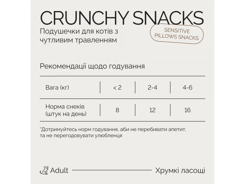 Дополнительное питание для котов Savory Cats Snacks Pillows Sensitive, обогащенное витаминами и таурином. Хрустящие подушечки улучшают кровообращение десен и механически очищают зубной налет. Также хорошо подходят для пожилых любимцев и тех, у кого есть проблемы с чувствительностью зубов. Активные пребиотики, дрожжи и растительная клетчатка мягко помогают поддерживать нормальную работу ЖКТ любимцев с чувствительным пищеварением.