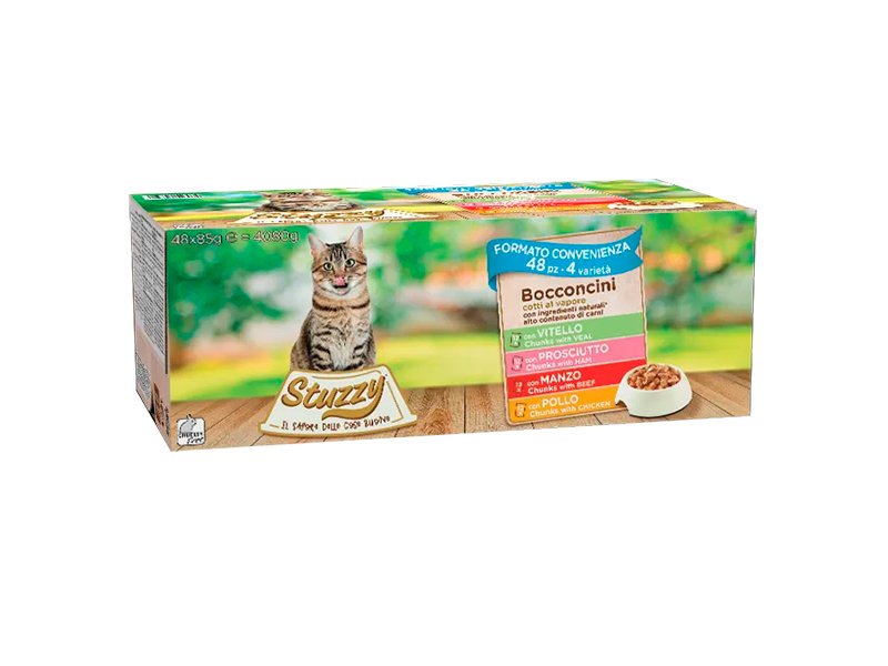 Влажный корм для кошек Stuzzy Cat Multipack – великолепное застолье любимых вкусов вашего питомца. Аппетитные 4 блюда с телятиной, ветчиной, говядиной и курицей состоят из небольших нежных мясных кусочков, которые медленно приготовлены на пару и подаются в густом изысканном соусе.