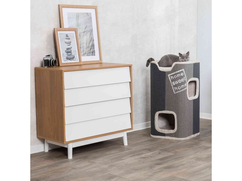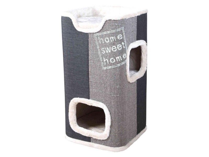Компактная когтеточка дом, высотой 78 сантиметров. Имеет три яруса, на каждом ярусе имеется съемный лежак.