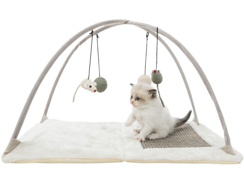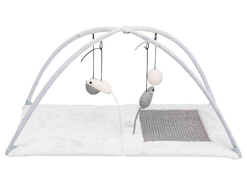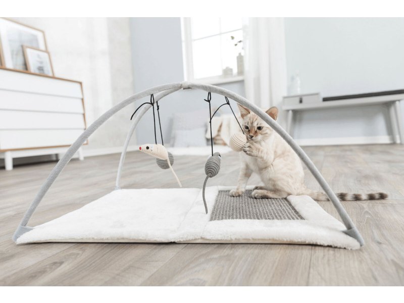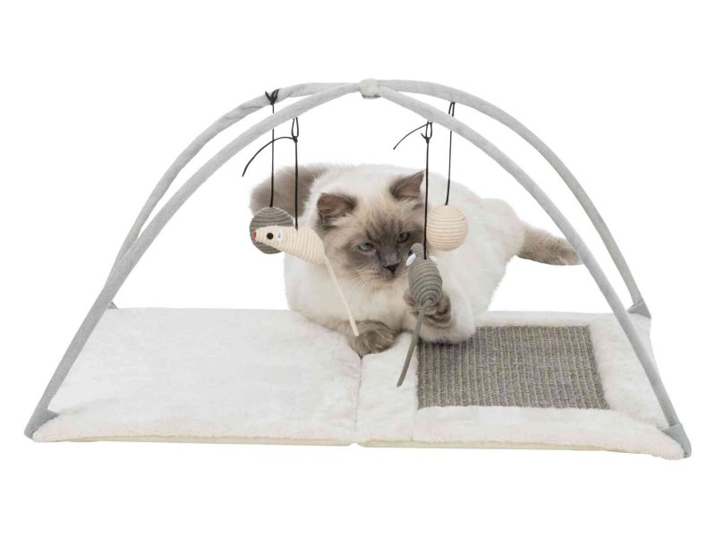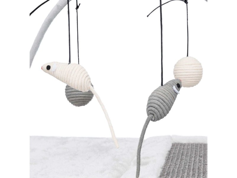 Игровая площадка для кошек с устойчивым куполом, плюшевым местом для отдыха, когтеточкой и четырьмя игрушками.