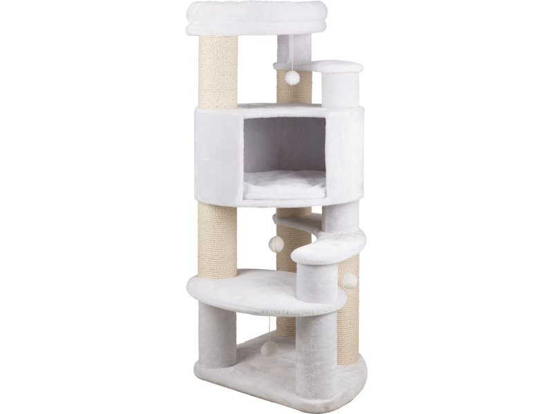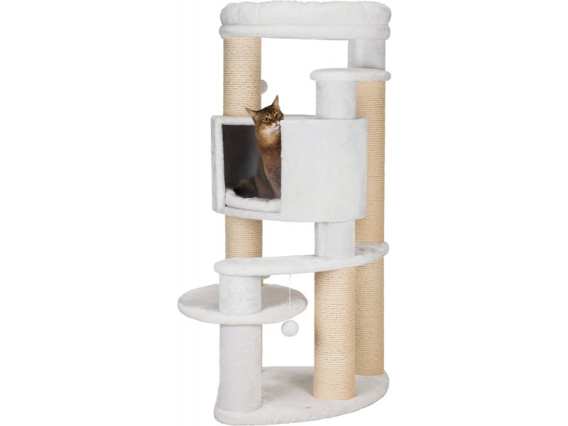 Обит комплекс приятным плюшем, а столбики которые служат опорой для платформ, формирующих ярусы, обиты крепким и износоустойчивым сизалем.