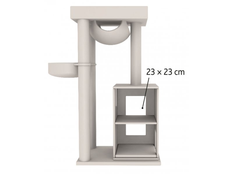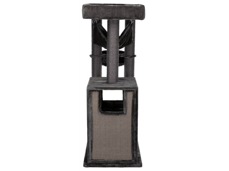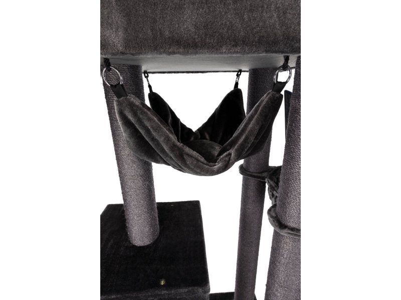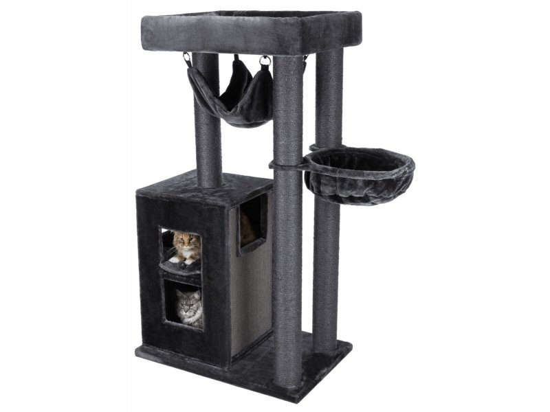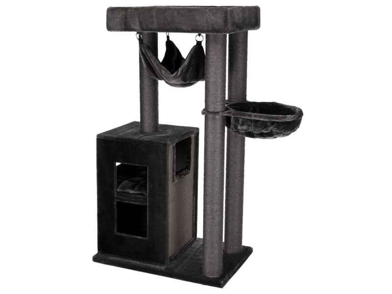 Многоуровневый игровой комплекс для кошек с несколькими домиками, мягкими местами, подвесными гамаками.