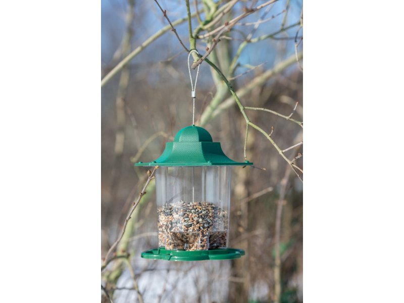 Стильная уличная кормушка для диких птиц. Дизайн стилизован под уличный фонарь. Подвешивается за петельку и имеет удобную посадочную площадку. Прозрачный резервуар позволяет контролировать расход корма и его своевременное наполнение.