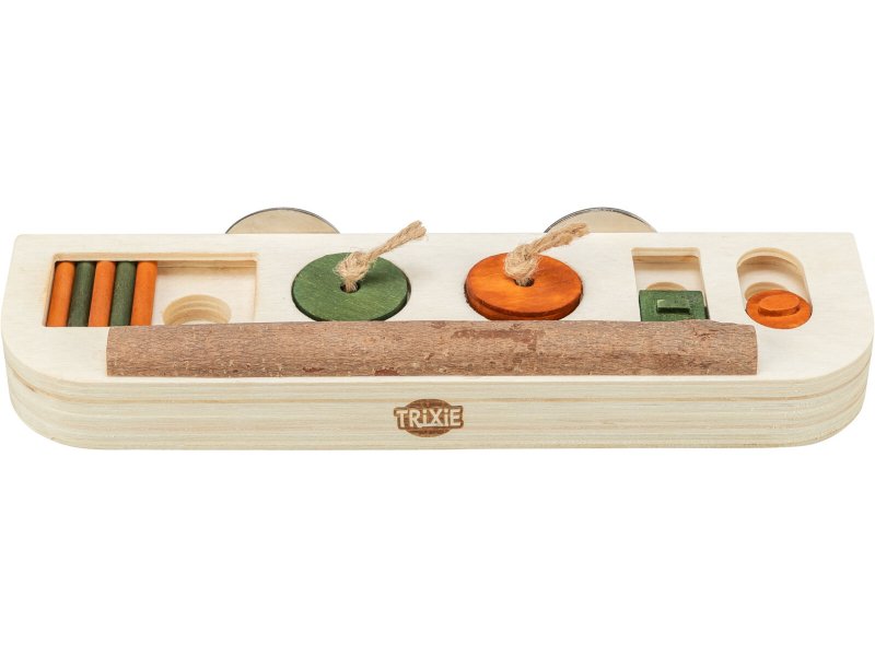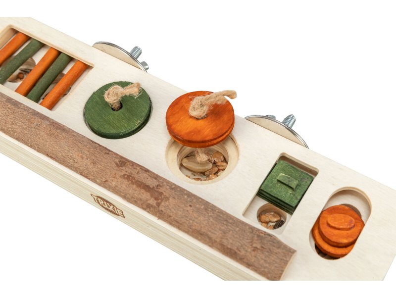 Игрушка изготовлена из натурального дерева и включает в себя несколько деревянных планок, крышек и углублений, куда можно помещать лакомства.