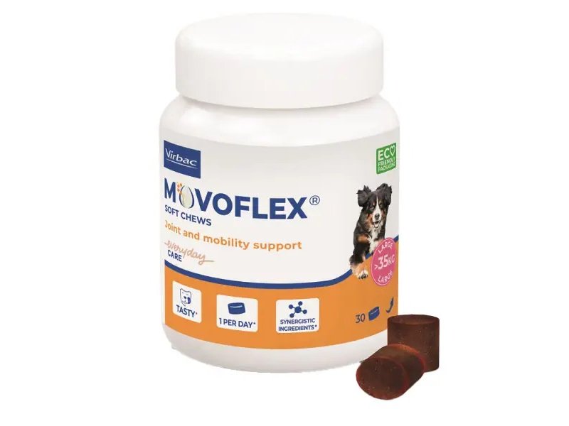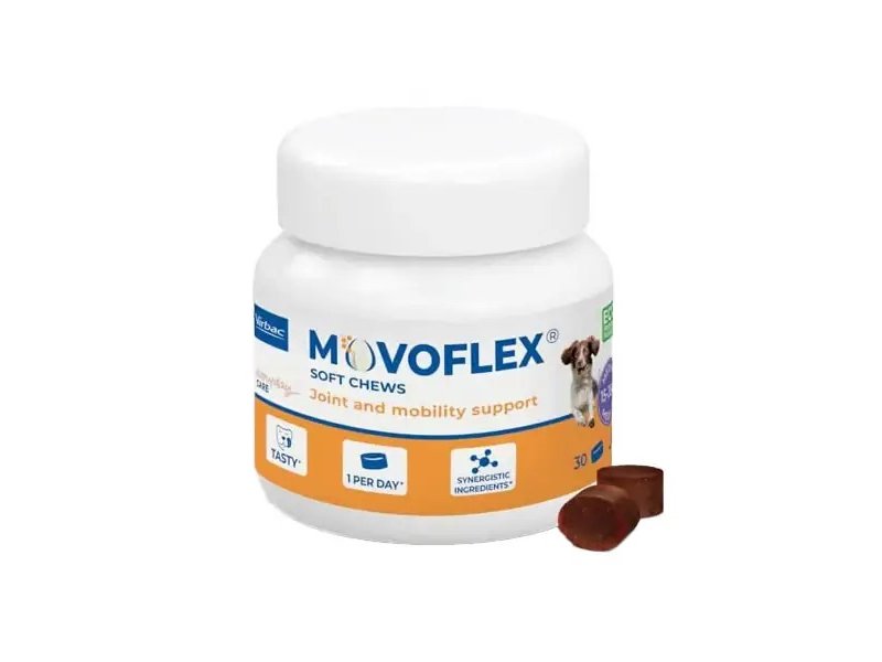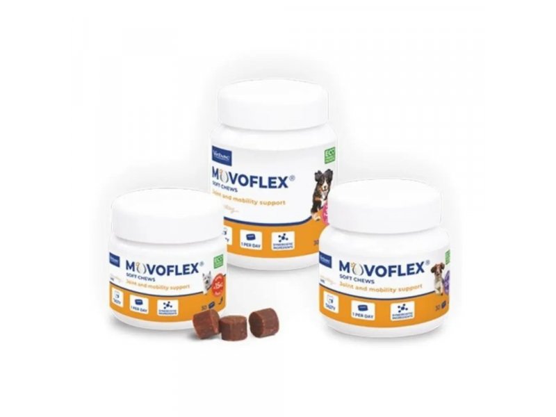 Состав Virbac Мовофлекс: прежелатинизированный рис, глицерин, производные растительного происхождения, прежелатинизированный кукурузный крахмал, рафинированное подсолнечное масло, сорбит, мембрана яичной скорлупы 1 3,3 %, сахар, гороховые протеины, дрожжи, Прежелатинизированный рисовый крахмал, сахарная тростниковая патока, мука криля 1,85 %, мальтодекстрин, мука морских водорослей (Haematococcus Pluvialis)2 0,83 %, минералы, гиалуроновая кислота (высокий и низкий PM) 0,49 %, порошкообразная целлюлоза, ароматизатор : Экстракт босвеллии серрата: 5,7 г, Консервант: Лимонная кислота: 7,3 г.