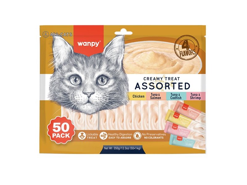 Какие лакомства выбрать для любимого кота? Не нужно ломать голову – Wanpy Creamy Treat Assorted предлагает сразу четыре вкуса в одном наборе! Нежное угощение с курицей, тунцом и лососем, тунцом и треской, а также тунцом и креветками понравится даже самому привередливому коту.