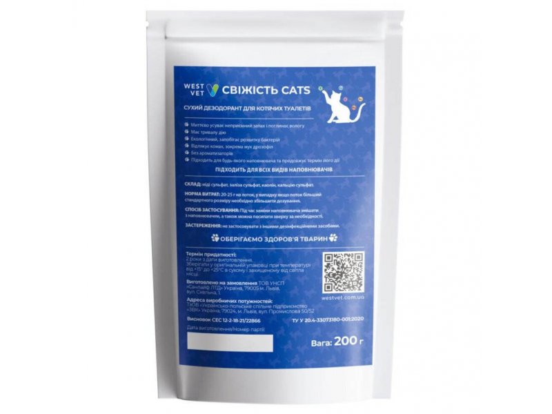 Свежесть CATS эффективно поглощает влагу в местах применения и неприятные запахи. Отпугивает взрослых насекомых, в т.ч. мух дрозофил и уничтожает личинки мух. Обладает антисептическими свойствами. Не содержит никаких раздражителей для кожи или вредных для окружающей среды веществ.