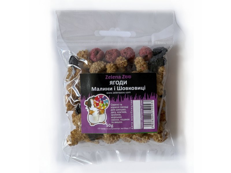 ЯГОДЫ МАЛИНЫ и ШЕЛКОВИЦЫ 50 г Zelena Zoo - вкусное и полезное лакомство супер премиум класса для шиншилл и дегу, а также для хомяков, кроликов, морских свинок, песчанок, крыс и мышей.