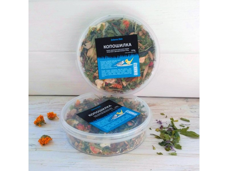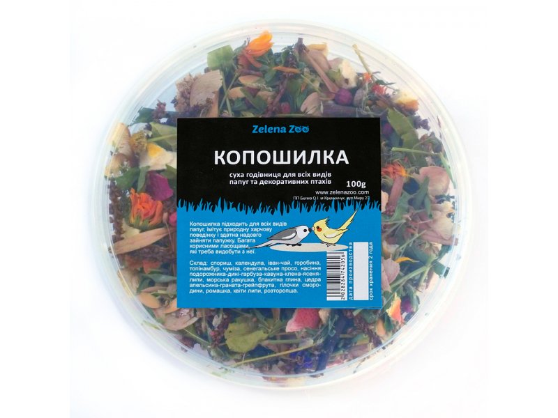 Копошилка для попугаев (сухая кормушка) 100 г Zelena Zoo - это емкость с разнообразными травами и семенами, веточками и сушеными полезными веществами, похожими на естественную среду пернатых. Подходит для всех видов попугаев и декоративных птиц. Имитирует естественное пищевое поведение и способна надолго занять птицу.