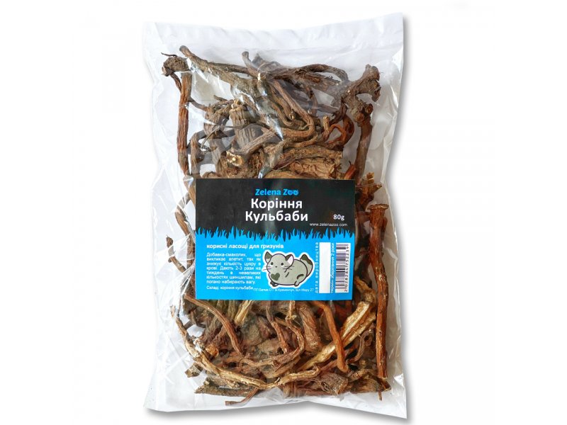 Корни Одуванчика 80 г Zelena Zoo - это полезные вкусности для здоровья ваших любимцев. Способствуют улучшению пищеварения, нормализации обмена веществ и укреплению иммунитета. Помогают выводить шлаки и токсины из организма. Укрепляют зубы и кости. Улучшают состояние шерсти и кожи.