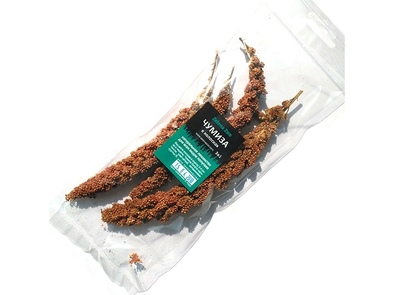 Просо в колосках позволяет не только получить удовольствие от вкуса, но и является прекрасной возможностью физических занятий для птицы: птичка сама выклевывает зерна из натуральных соцветий. Добавляйте сенегальское просо в колосках в рацион вашего любимца. Это особенно необходимо перед периодом размножения, во время линьки, а также для подкормки птицы. Чумиза - однолетнее культурное растение, является кормовой и зерновой культурой.