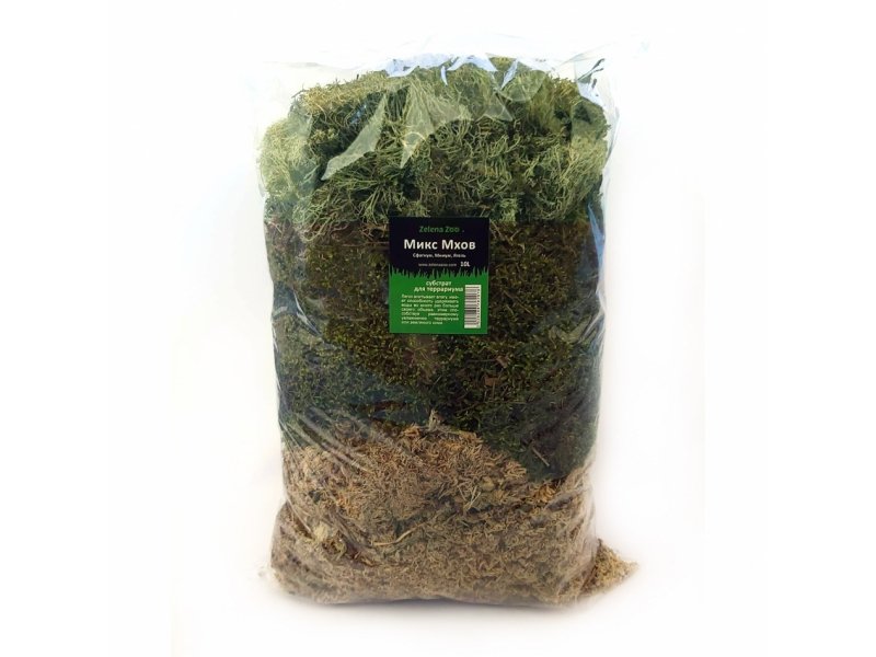 Микс мхов 10 л (сфагнум, мниум, ягель) Zelena Zoo - эти природные лесные мхи увеличивают и поддерживают влажность в террариуме. Не содержат химических добавок. Мох хорошо впитывает воду и хорошо сохраняет влажность, что обеспечивает равномерное увлажнение террариума для ахатин и различных рептилий. Объем: 10 л Вес: 300-400 грамм